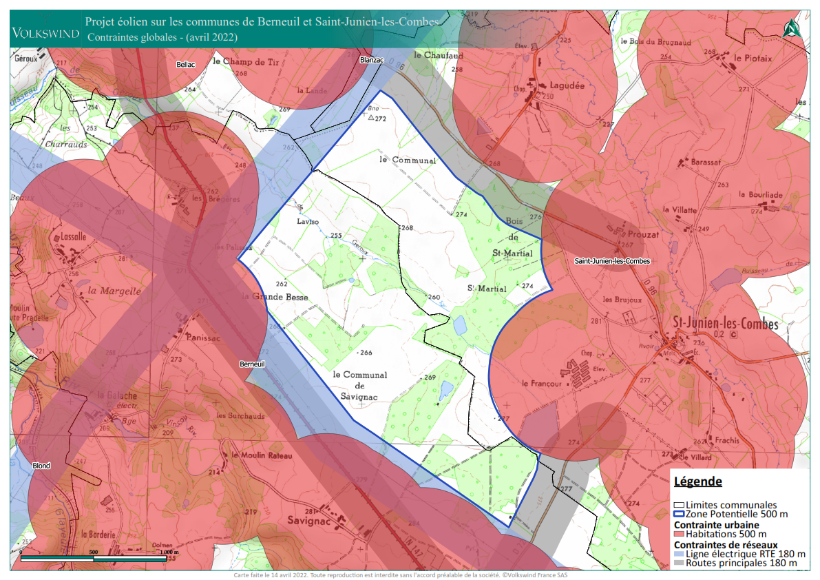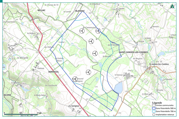 Le projet de Berneuil – St Junien les Combes est situé à cheval sur les communes de Berneuil et Saint-Junien-les-Combes en Haute-Vienne. Le secteur d’étude se trouve en zone favorable au développement éolien du SRE (Schéma Régional Eolien) et se caractérise par un bon gisement éolien, de 6,5 m/s à 100 m.